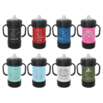 Polar Camel Sippy Cups are 10oz double wall vacuum insulated powder coated cups featuring removable handles, a silicone boot, and spill proof lid. The screw on lid features a hard plastic spout with a rubber leak proof valve. The cup can be used with or without the heavy-duty plastic handles that attach to the lid. They offer plenty of space for personalization and can be taken apart for easy cleaning. The plastic lid may need an occasional deep cleaning.